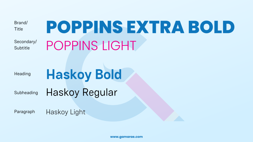 In this step, you should decide the fonts for your logo, letterheads, and content. For Grae Content, I used two weights of the same font, Poppins, because I wanted it to be flexible. I have always been partial to round fonts like Century Gothic, Questrial, and Comfortaa, so Poppins was not a surprising selection.