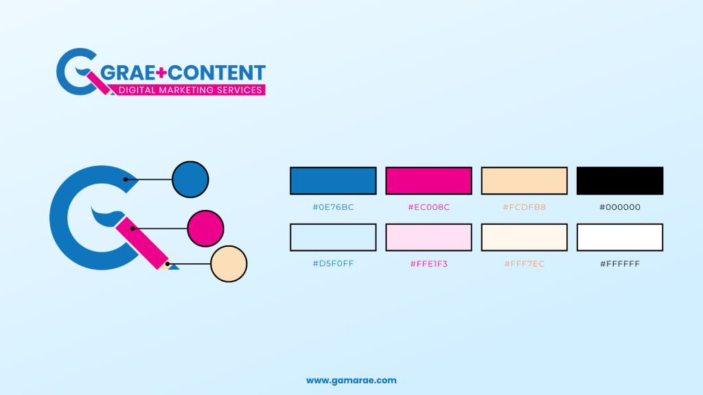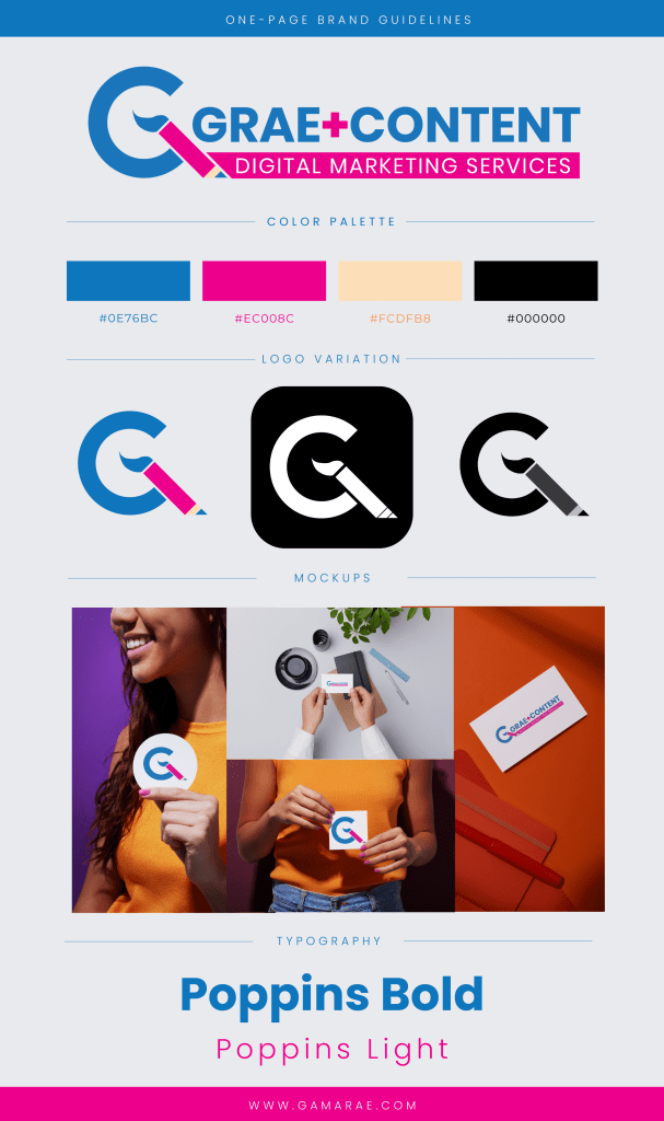 My brand, Grae Content Digital Marketing Services (Grae Content or Grae+Content), uses blue as a primary color because I want to invoke business trust and reliability. Blue is also the primary color of brands like Facebook, Linkedin, and Twitter (before they rebranded to X). The pink was a secondary color that signified sophistication as used in Victoria Secret’s logo and the fact that the company is female-owned. The logo colors align with Grae Content’s promise to provide content that are both clean (blue) and sophisticated (pink).